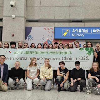 S dobrou náladou a za slunečného počasí vyrážíme s třicítkou nejstarších dětí Koncertního sboru na v pořadí již sedmé turné do Jižní Koreje. Je neděle odpoledne a doprava před Prahou houstne, přesto nás autobus přiváží na letiště včas, zavazadla máme odbavena a přesouváme se do bezcelního prostoru. Dospělý doprovod tentokrát posílily dvě členky výboru Kruhu přátel Severáčku – Petra Stejskalová a Monika Šourková, jedeme tedy kromě dvou chlapců v ryze dámské sestavě. Průběh letu s Turkish airlines do Istanbulu byl hladký, na přestupu jsme však zjistili, že nás čeká téměř sedmihodinové čekání kvůli zpoždění našeho dalšího letu do Soulu. Nebyli to však Severáčci, aby si neporadili, navíc jsme obdrželi i kompenzaci v podobě jídla zdarma ve vybraných restauracích a tak jsme těch sedm hodin přečkali bez jakékoli újmy😊. Samotný let proběhl pak opět bez sebemenších problémů, posádka se o nás skvěle starala a krátce po 22. hodině jsme v pořádku přistáli na letišti v Incheonu. Po poslední pasové kontrole a vyzvednutí zavazadel nás již netrpělivě vyhlíží v příletové hale pan Chang spolu s panem Kimem, kteří nás budou po celé turné doprovázet. Kromě vřelého přijetí (pan Chang si všechny děti z minulého turné pamatuje jmény!) nemůže chybět první společná fotka s velkým transparentem našeho letošního turné.