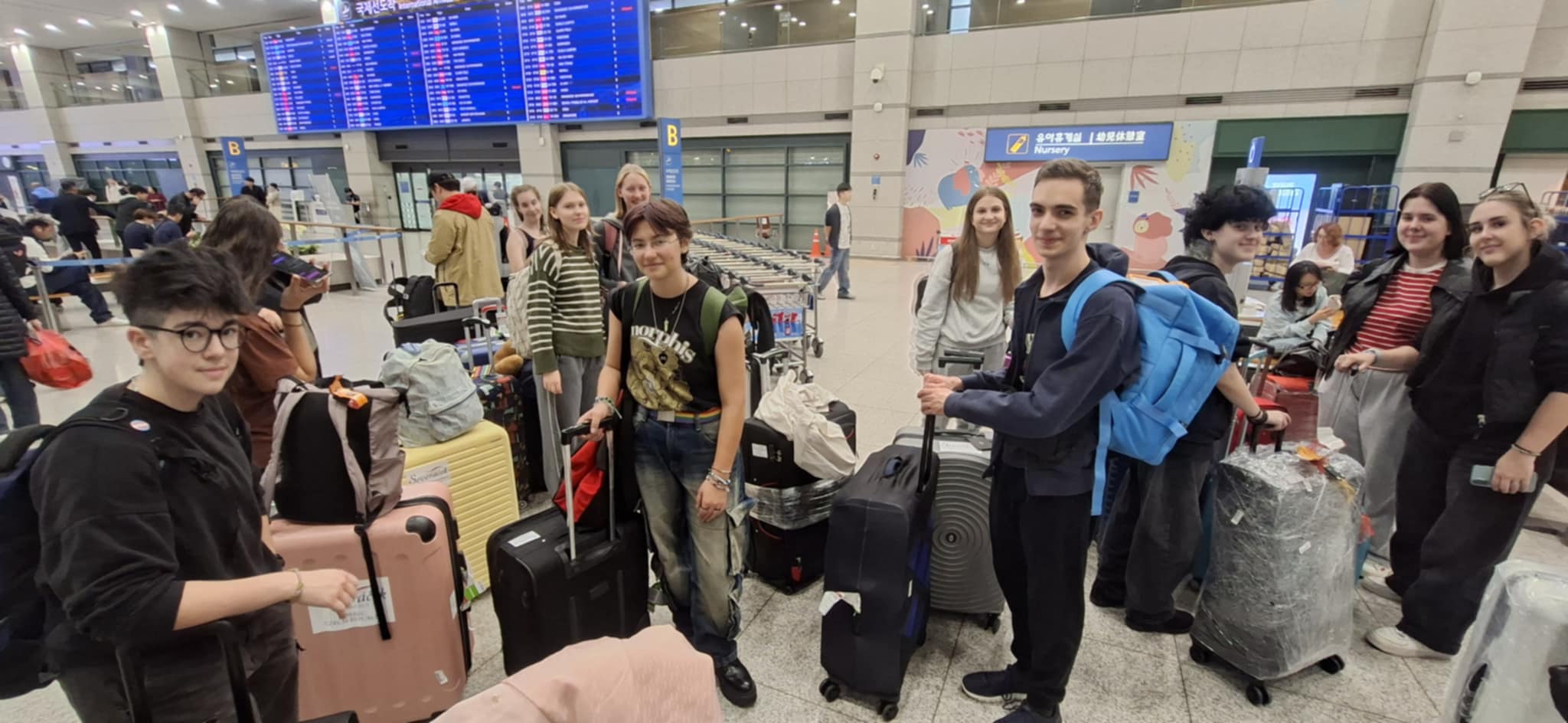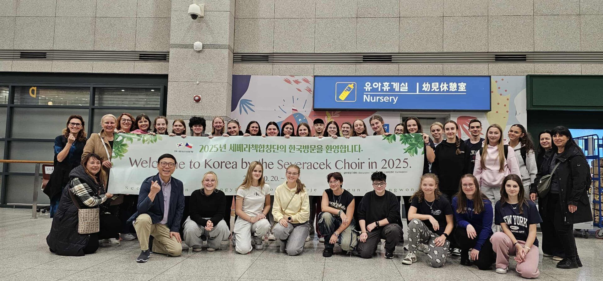 S dobrou náladou a za slunečného počasí vyrážíme s třicítkou nejstarších dětí Koncertního sboru na v pořadí již sedmé turné do Jižní Koreje. Je neděle odpoledne a doprava před Prahou houstne, přesto nás autobus přiváží na letiště včas, zavazadla máme odbavena a přesouváme se do bezcelního prostoru. Dospělý doprovod tentokrát posílily dvě členky výboru Kruhu přátel Severáčku – Petra Stejskalová a Monika Šourková, jedeme tedy kromě dvou chlapců v ryze dámské sestavě. Průběh letu s Turkish airlines do Istanbulu byl hladký, na přestupu jsme však zjistili, že nás čeká téměř sedmihodinové čekání kvůli zpoždění našeho dalšího letu do Soulu. Nebyli to však Severáčci, aby si neporadili, navíc jsme obdrželi i kompenzaci v podobě jídla zdarma ve vybraných restauracích a tak jsme těch sedm hodin přečkali bez jakékoli újmy😊. Samotný let proběhl pak opět bez sebemenších problémů, posádka se o nás skvěle starala a krátce po 22. hodině jsme v pořádku přistáli na letišti v Incheonu. Po poslední pasové kontrole a vyzvednutí zavazadel nás již netrpělivě vyhlíží v příletové hale pan Chang spolu s panem Kimem, kteří nás budou po celé turné doprovázet. Kromě vřelého přijetí (pan Chang si všechny děti z minulého turné pamatuje jmény!) nemůže chybět první společná fotka s velkým transparentem našeho letošního turné.