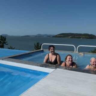 Dnešní dopoledne v hotelovém resortu Vigo se zapsalo zlatým písmem do hitparády našich nejlepších korejských zážitků. Připadali jsme si jako na dovolené snů – bazén, výhled na moře, azurové nebe, nemělo to nejmenší chybu, snad jen teplota vody přilákala kromě nás dospělých jen hrstku odvážlivců, kteří prošli přípravou na KRO (pro neznalé – Klub ranních otužilců) v Letařovicích. Bohužel tu nemůžeme pobýt déle, čeká nás další program a tak před polednem ještě jedna společná fotka u bazénu a pak již odjíždíme na ostrov Geoje, kde se máme setkat s milými hostiteli z dětského sboru Sanctus.