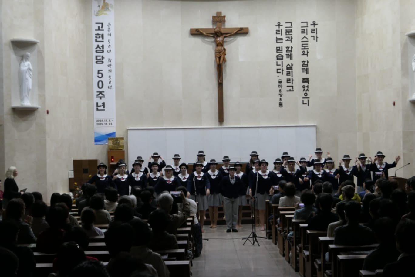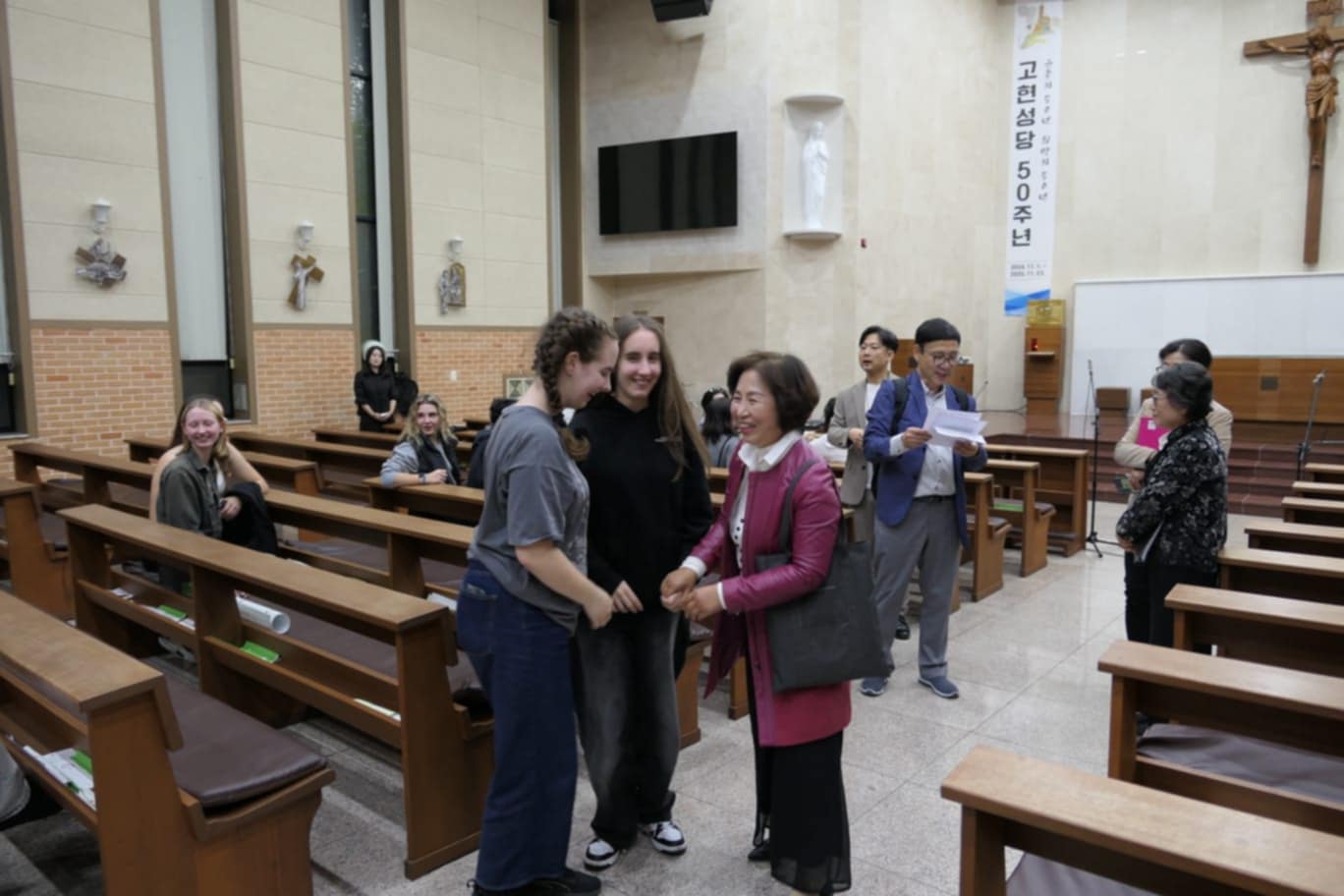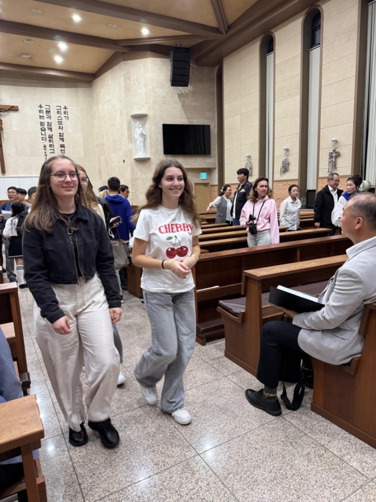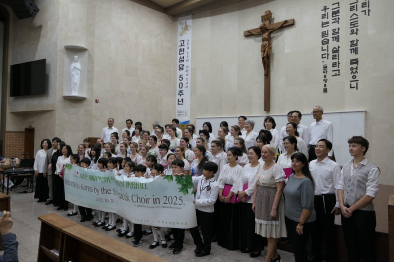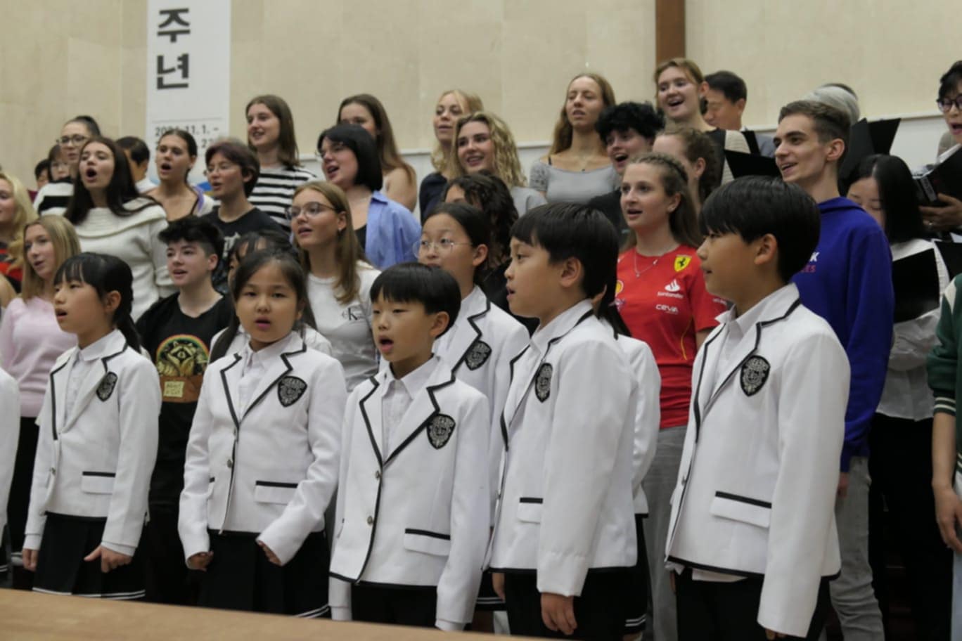 Po příjezdu na ostrov Goeje jsme si ještě prohlédli areál zajateckého tábora z Korejské války a pak jsme se již vydali za našimi hostiteli. Dnešní koncert se koná v kostele, musíme tedy vyzkoušet techniku – Evička hraje na elektronické piano napojené na velké reproduktory visící seshora, což je pro nás trochu neobvyklé, ale nakonec se vše podaří a my dnes poprvé máme v programu kromě obvyklých skladeb i novinku z našeho repertoáru – Bohemian Rhapsody se skvělým sólem Terezky. Je to také malý hudební dárek pro pana sbormistra Cho, který při minulém turné tuto skladbu zpíval na koncertu. Po zkoušce si hostitelské rodiny rozebírají severáčkovské děti a společně jedou na večeři, my dospělí máme v restauraci připravený bohatý stůl s typickými korejskými pochutinami, jako hlavní chod se podává makrela. Je výtečná, jen její vykostění pouze za pomoci hůlek vyžaduje opravdu velkou zručnost😊. Koncert začíná v půl osmé, některé děti doslova dobíhají pár minut před začátkem, takže znovu posouváme hranice rekordu v rychlosti oblékání kroje 😊 (4 minuty). Naštěstí jako první zpívá korejský dětský sbor, stihnou to tedy nakonec všichni a první půlka koncertu může začít. Kostel je téměř plný, diváci velmi nadšeně aplaudují a po malém intermezzu, které vyplní smíšený sbor Sanctus, nastupují naše děti na folklórní část programu. Vše krásně vyšlo, musím tu vyzdvihnout naši výbornou instrumentální sekci, která je již skvěle sehraná – Tonička na housle, Šáryn na flétny, Jonáš na bicí nástroje. Jsme moc rádi, že máme ve sboru tak talentované muzikanty. Na závěr koncertu se k nám přidává celý korejský sbor a zpíváme společně Urinen a Barami, je to zážitek pro všechny zúčastněné. Děti po koncertě odcházejí do rodin a my se těšíme, co nám budou zítra vyprávět.