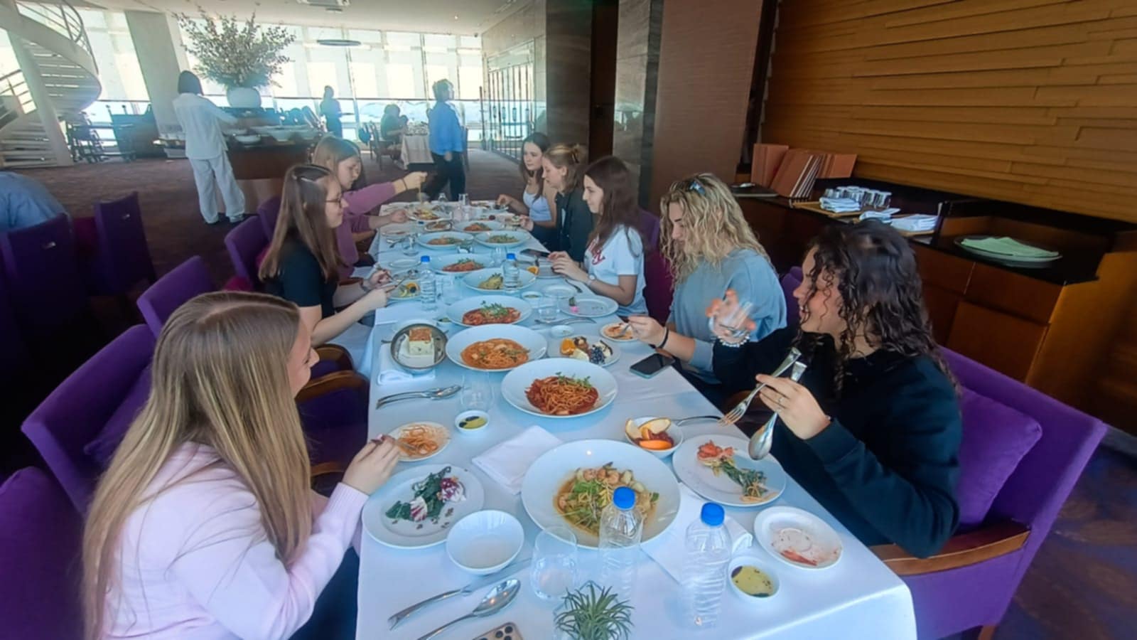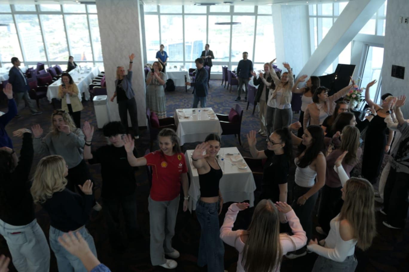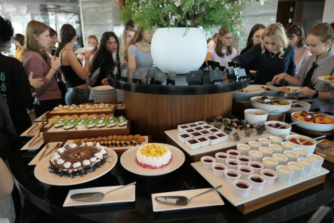 Ještě než jsme ale dorazili do místa konání dnešního koncertu, zastavili jsme se na oběd ve městě Yeosu, které je považováno za jedno z nejhezčích v Koreji. I oběd pokračoval v intencích celého dopoledne – v luxusním hotelu u areálu Expo 2012 jsme vyjeli do 26. patra a kromě italských specialit jsme měli možnost si pochutnávat i na vynikajících salátech a dortících. Málo platné, asi přijedeme domů o něco těžší… 🙂 Panoramatický výhled z balkonu restaurace byl úžasný. Jako poděkování jsme hostitelům udělali „flash mob“ s písní Les Champs Elysées – v podání našich dětí je to s tancem opravdu paráda.