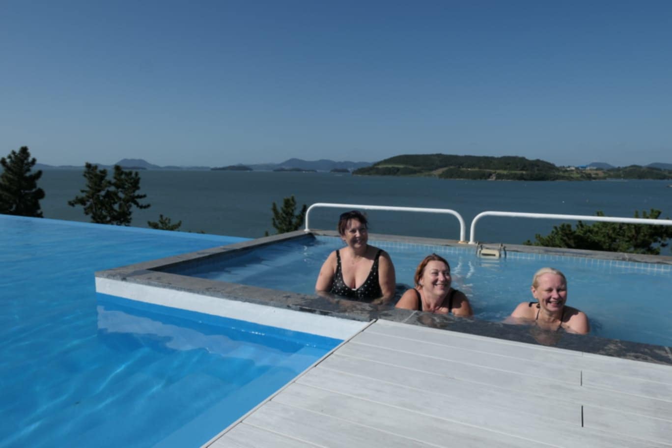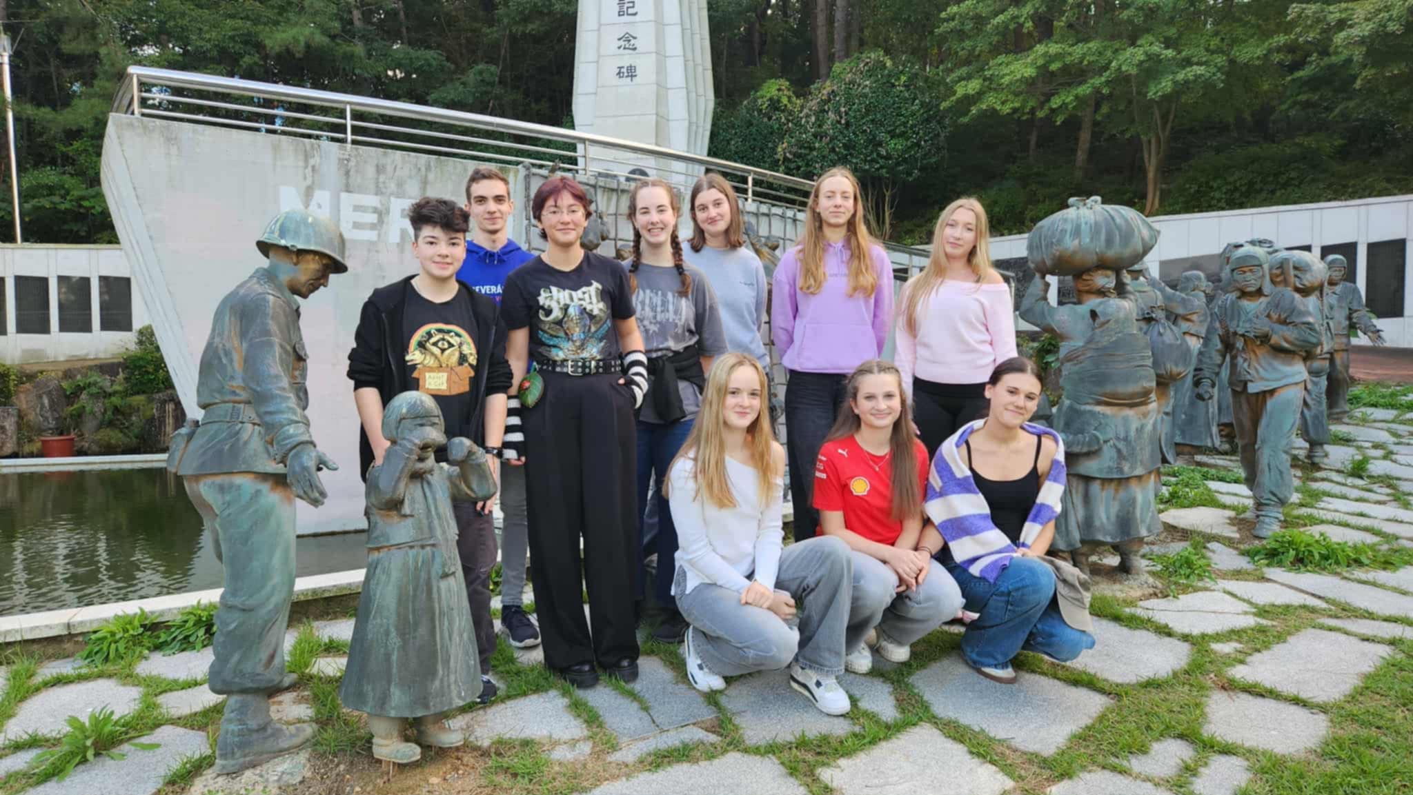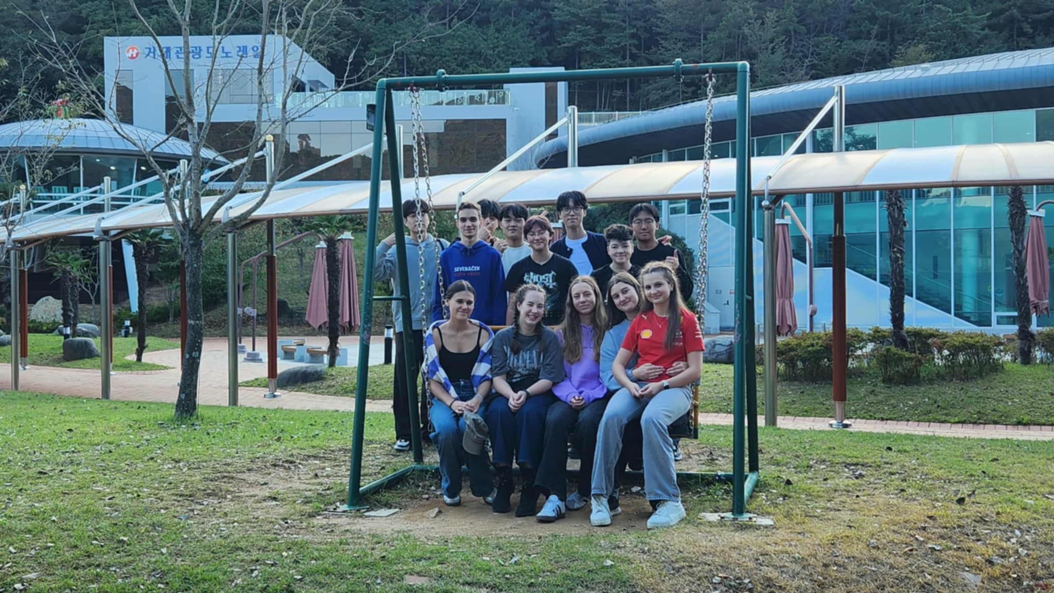 Dnešní dopoledne v hotelovém resortu Vigo se zapsalo zlatým písmem do hitparády našich nejlepších korejských zážitků. Připadali jsme si jako na dovolené snů – bazén, výhled na moře, azurové nebe, nemělo to nejmenší chybu, snad jen teplota vody přilákala kromě nás dospělých jen hrstku odvážlivců, kteří prošli přípravou na KRO (pro neznalé – Klub ranních otužilců) v Letařovicích. Bohužel tu nemůžeme pobýt déle, čeká nás další program a tak před polednem ještě jedna společná fotka u bazénu a pak již odjíždíme na ostrov Geoje, kde se máme setkat s milými hostiteli z dětského sboru Sanctus.