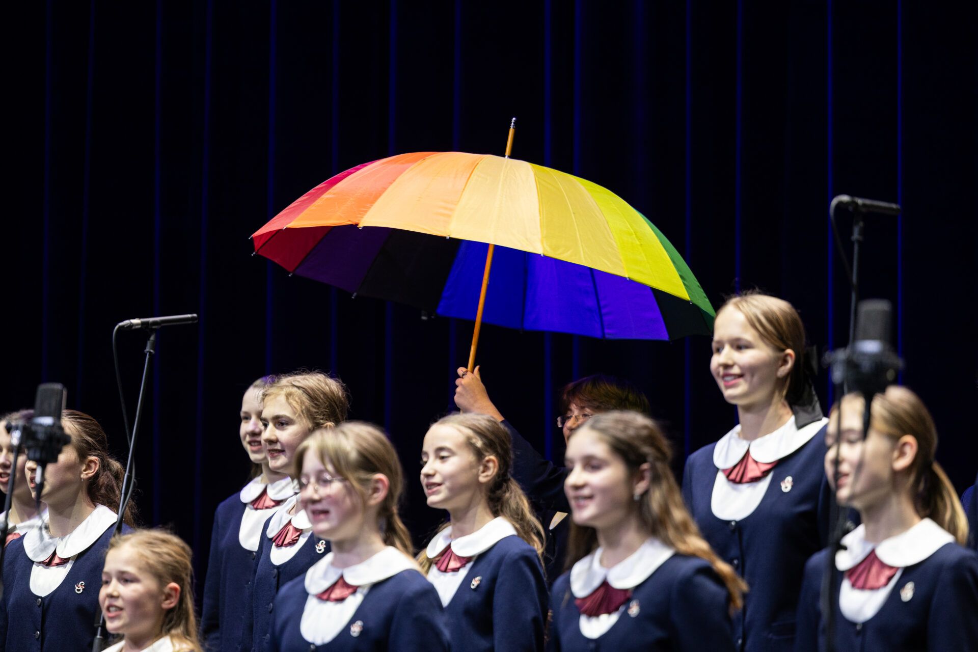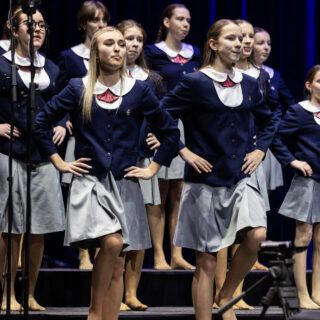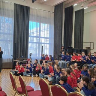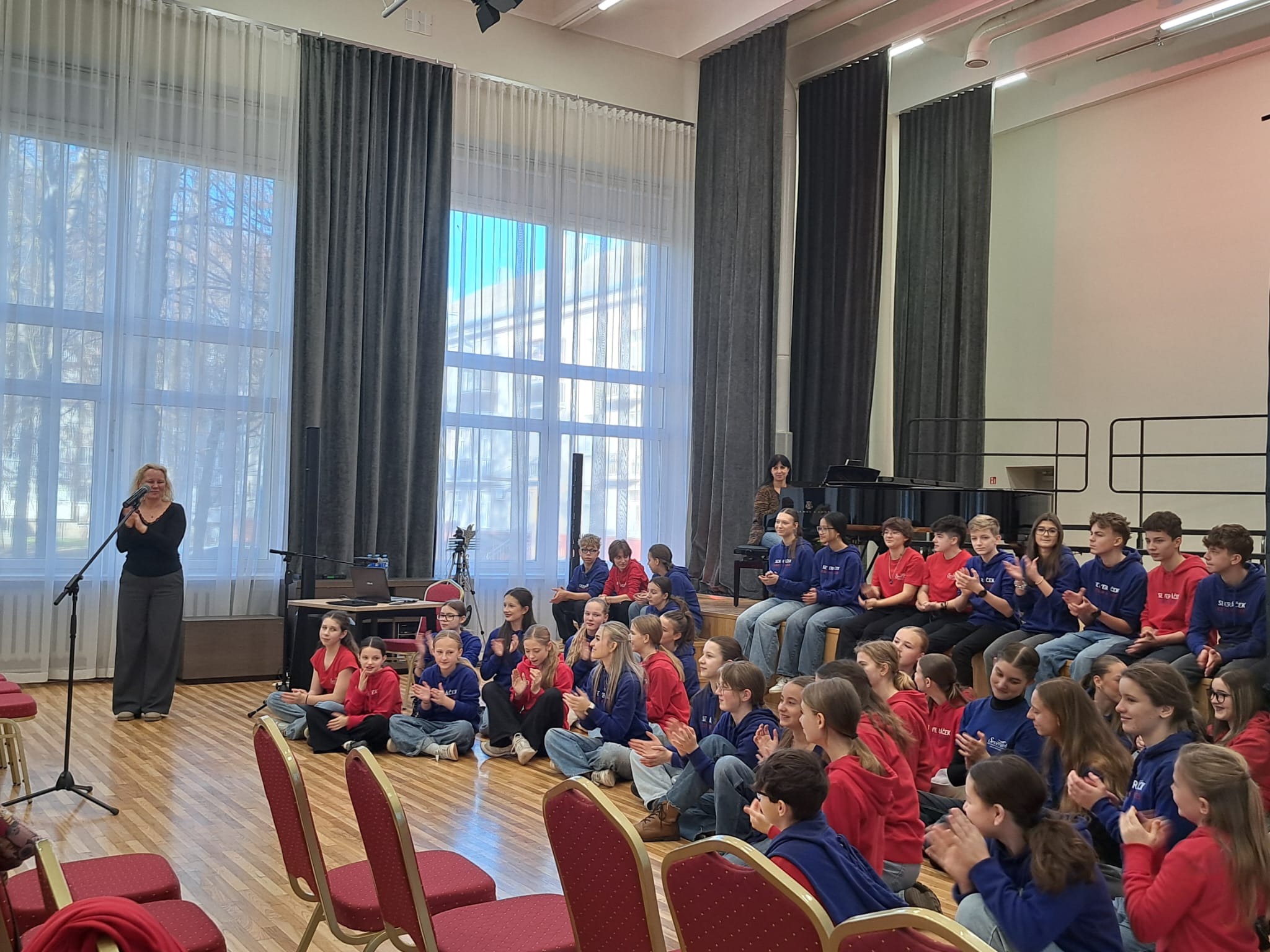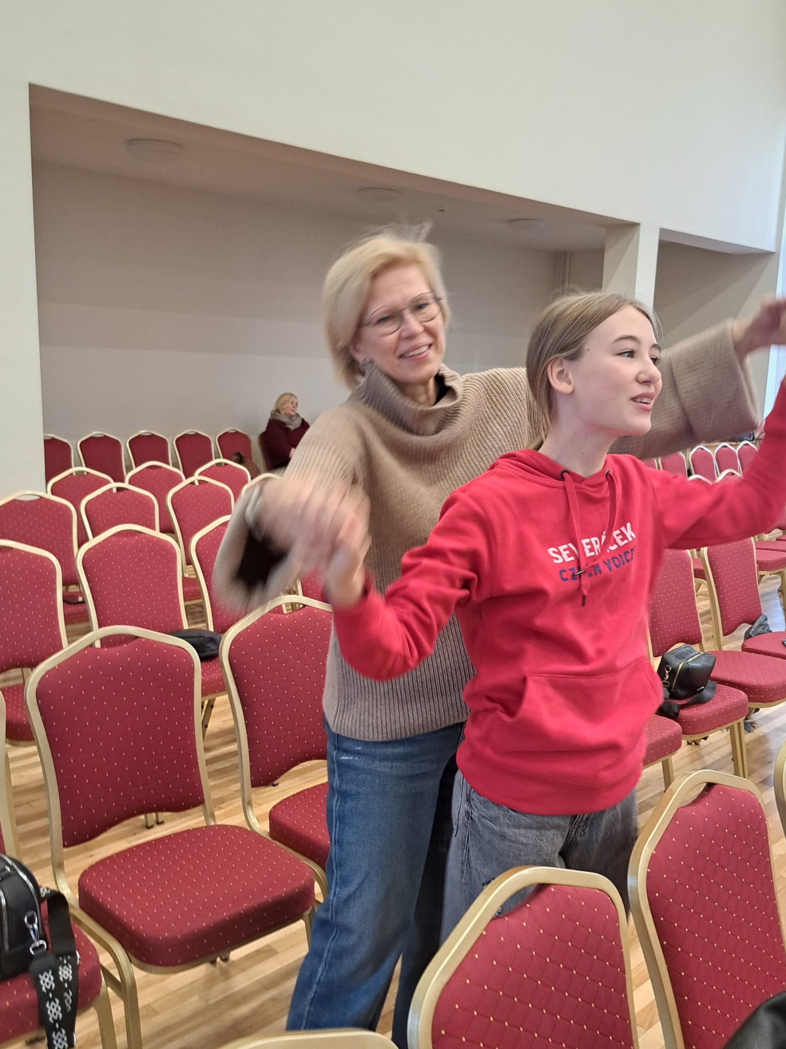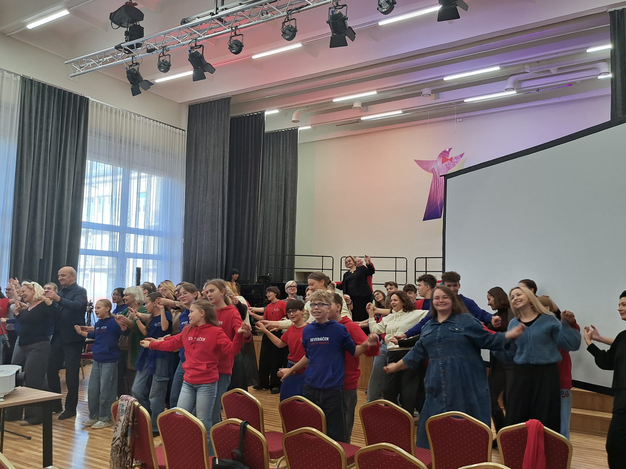 Sobotní ráno nás přivítalo sluníčkem a opět jsme se sešli v hudební škole sboru Dagilélis na dopolední workshop se sbormistry a učiteli, tentokrát jsme je zapojili do duchovního chorálu Veni, Creator Spiritus, který si společně s našimi dětmi mohli po nacvičení zazpívat ve všech možných variacích. Pro odlehčení jsme na závěr zvolili Broučkovskou mazurku, která stejně jako v Koreji, vykouzlila i zde v Litvě spoustu úsměvů na tvářích našich hostů, zejména poté, co si pro ně do hlediště došly severáčkovské děti a vyzvaly je ke společnému tanci. Ve fotogalerii najdete důkaz, že to bylo oboustranně velmi příjemně strávené dopoledne. Po workshopu jsme měli ještě čas navštívit prodejnu místního výrobce něčeho velmi chutného (nesmím ani naznačovat😊, budou to určitě dárečky…) a poté jsme se přesunuli do sálu, kde se bude odpoledne konat hlavní koncert celého festivalu. Vyzkoušeli jsme si na jevišti vše potřebné a poté jsme se vydali na oběd do oblíbené restaurace Arkos. Nachází se uprostřed pěší zóny se spoustou obchůdků a kaváren, volný čas po obědě jsme tedy využili k příjemné procházce po městě. Před samotným koncertem jsme si ještě v hudební škole vyzkoušeli něco málo z choreografií a pak jsme se spolu s ostatními sbory přesunuli do koncertního sálu. V programu vystoupilo celkem šest sborů, na úvod se představil domácí sbor Dagilélis čítající bezmála sto zpěváků ve věku od 10 do 19 let, po nich následovaly další litevské sbory, Severáček byl jako host festivalu na programu poslední. Naše děti předvedly ve dvacetiminutovém okénku lidovou píseň Ej, děvča orešanské, poté oblíbenou Zkoušku na koncert, dále cyklus Písničky bez deštníku, suitu Už ho vedou Martina a na závěr naši novou hitovku Les Champs-Elysées. Vystoupení se jim moc povedlo a velký aplaus a ovace ve stoje byly zcela zasloužené. Chtěla bych ještě pochválit všechny sólisty – Adélku P. ve Zkoušce na koncert, Matyáše a Aničku v Ej, lásko, Majdu K., Aničku T., Amálku M. a Adélku P. v Už ho vedou, Martina a zejména Terezku B. a Lucinku Š. za přednes textu v litevštině a Šáryna za doprovod na flétny a bicí nástroje. Jsme na naše děti pyšné, jak dobře zvládly takto důležitý koncert a jak skvěle tím reprezentovaly celý Severáček. Věříme, že si v rodinách užijí krásný večer a nedělní volné dopoledne, však si ho zaslouží.