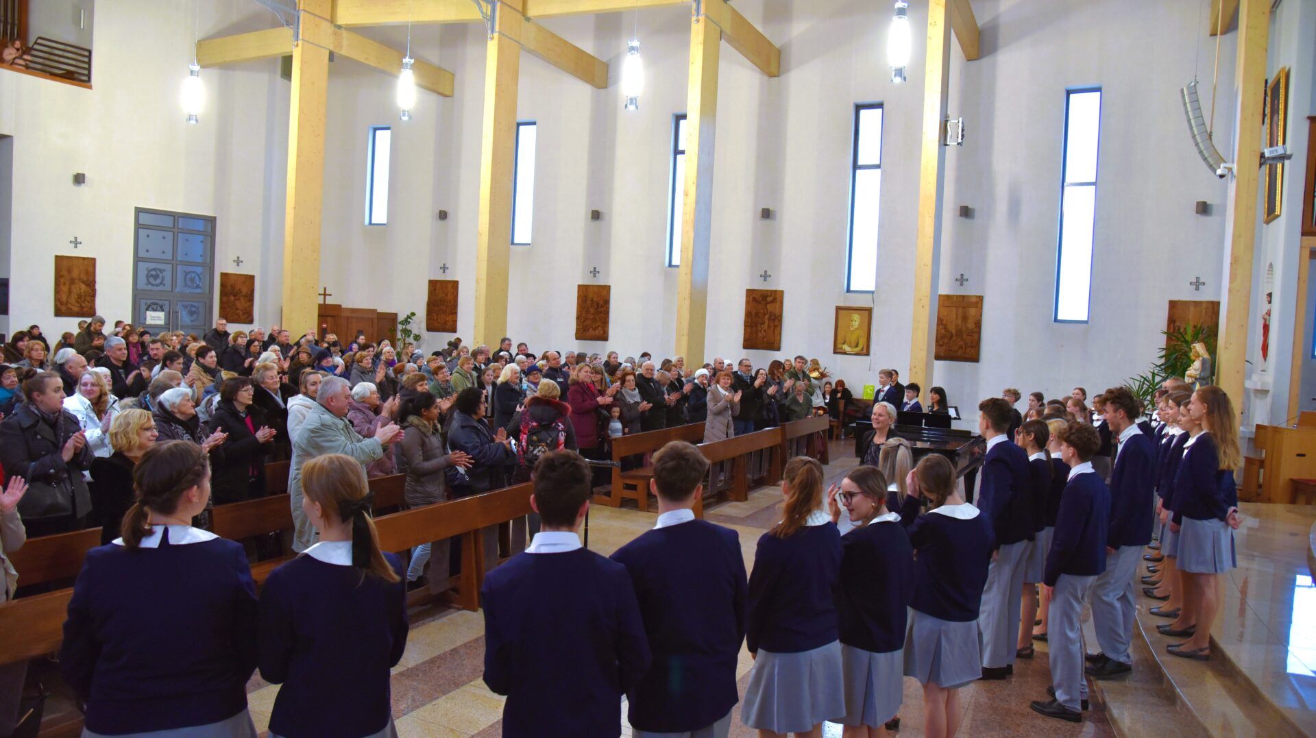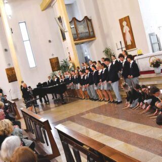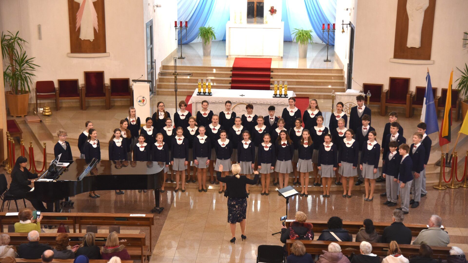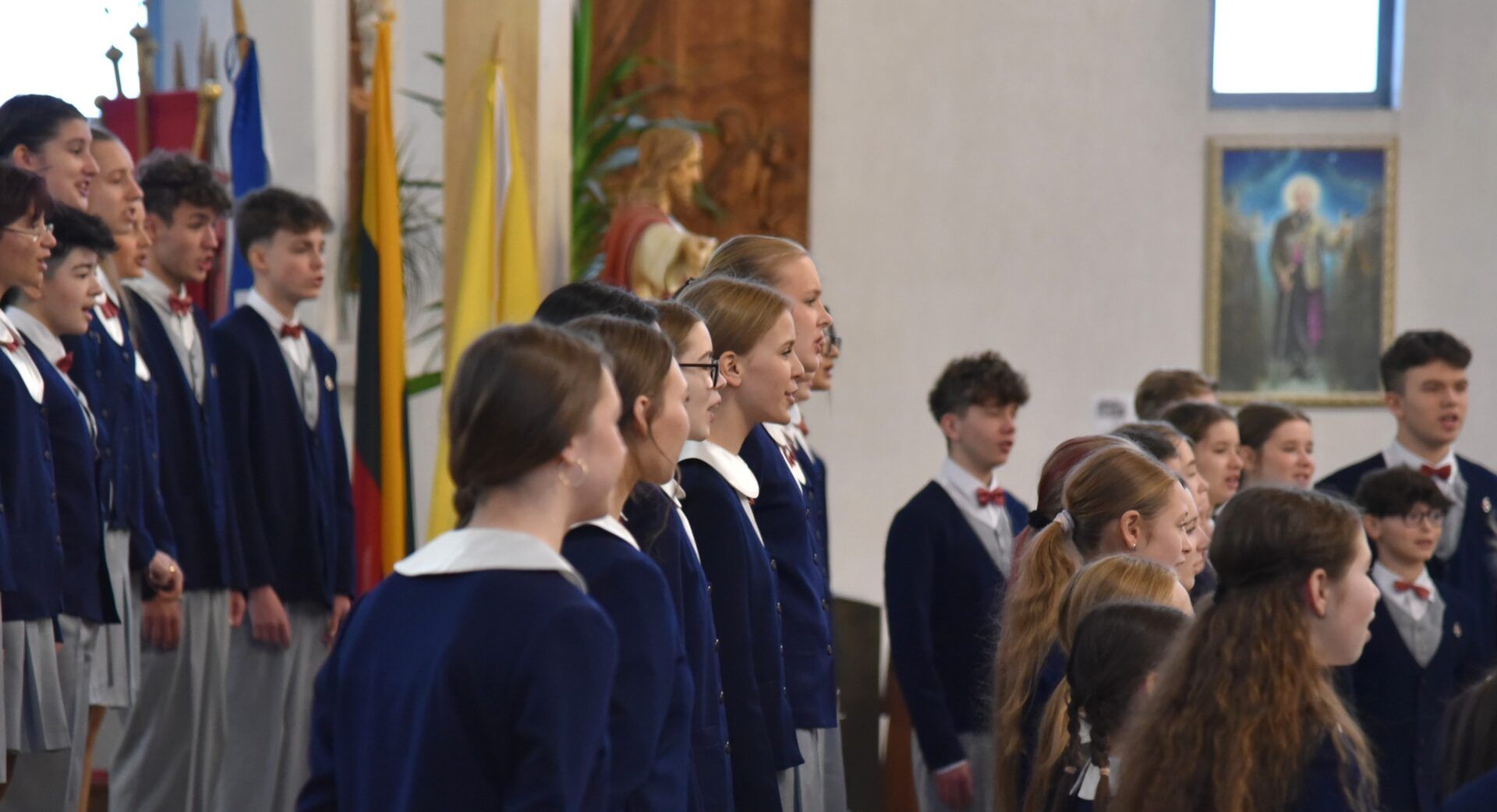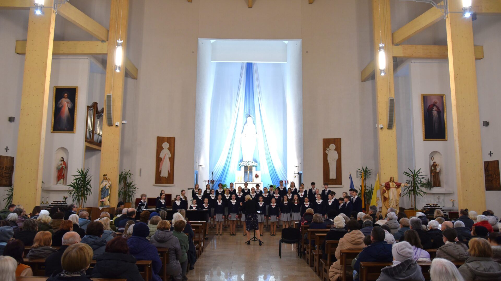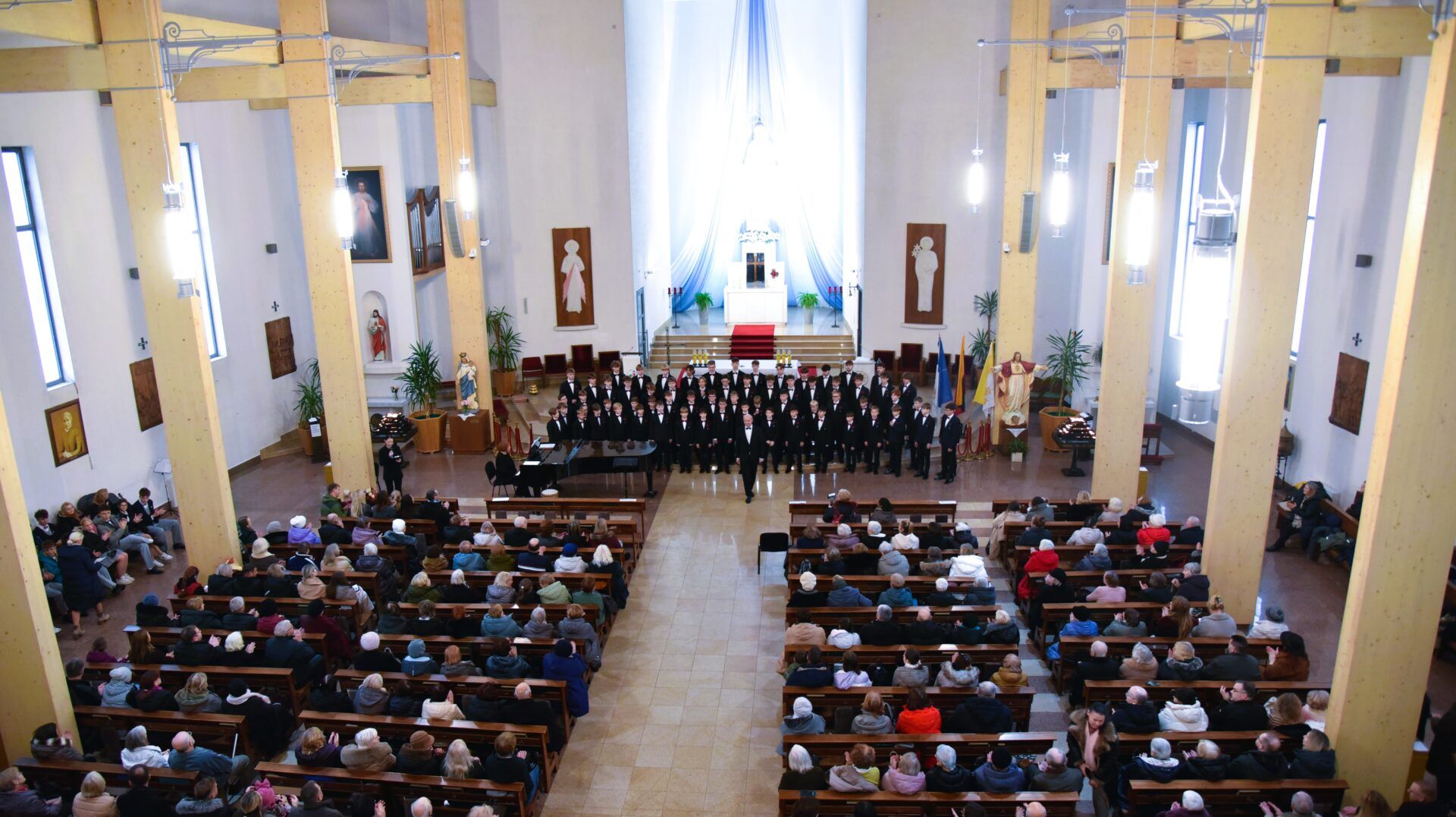 Náš zájezd se pomalu chýlí ke konci a my tu máme poslední festivalový den. Celé nedělní dopoledne strávily děti se svými hostitelskými rodinami, někde se šlo do ZOO, muzea či nakupovat, jinde se hrály deskové hry, někteří chlapci si prý raději dopřáli vydatný spánek😊. Po obědě jsme se všichni sešli u katolického kostela Mergelés Marijos v Šiauliai (mimochodem zkuste si to říct třikrát za sebou a máte skvělý jazykolam, ve skutečnosti se to vyslovuje „Šolé“), kde nás čekal již poslední koncert. Kromě Severáčku vystoupili i chlapci a mladí muži ze sboru Dagilélis. Oba dva programy měly duchovní charakter, sóla v Truvérské mši Petra Ebena měla zpívala tři nejstarší děvčata Adélka P., Anička T. a Majda K., byl to pro ně zároveň úplně poslední zájezdový koncert se Severáčkem. Ještě si s námi zazpívají v sobotu na Slavnostním koncertu v Divadle F. X. Šaldy. Kostel byl zaplněný do posledního místa a publikum opět odměnilo naše děti bouřlivým potleskem ve stoje. Byl to jeden ze zájezdových momentů, které si budeme ještě dlouho pamatovat. Zejména ukolébavka z opery Brundibár zněla v této chrámové akustice výjimečně průzračně. Po koncertu nám naši hostitelé domluvili bowling a pizzu v nedalekém nákupním centru, děti z obou sborů se tedy mohly dosytosti vydovádět na dráze a myslím, že to byl krásný závěr celého pobytu v Šiauliai.
