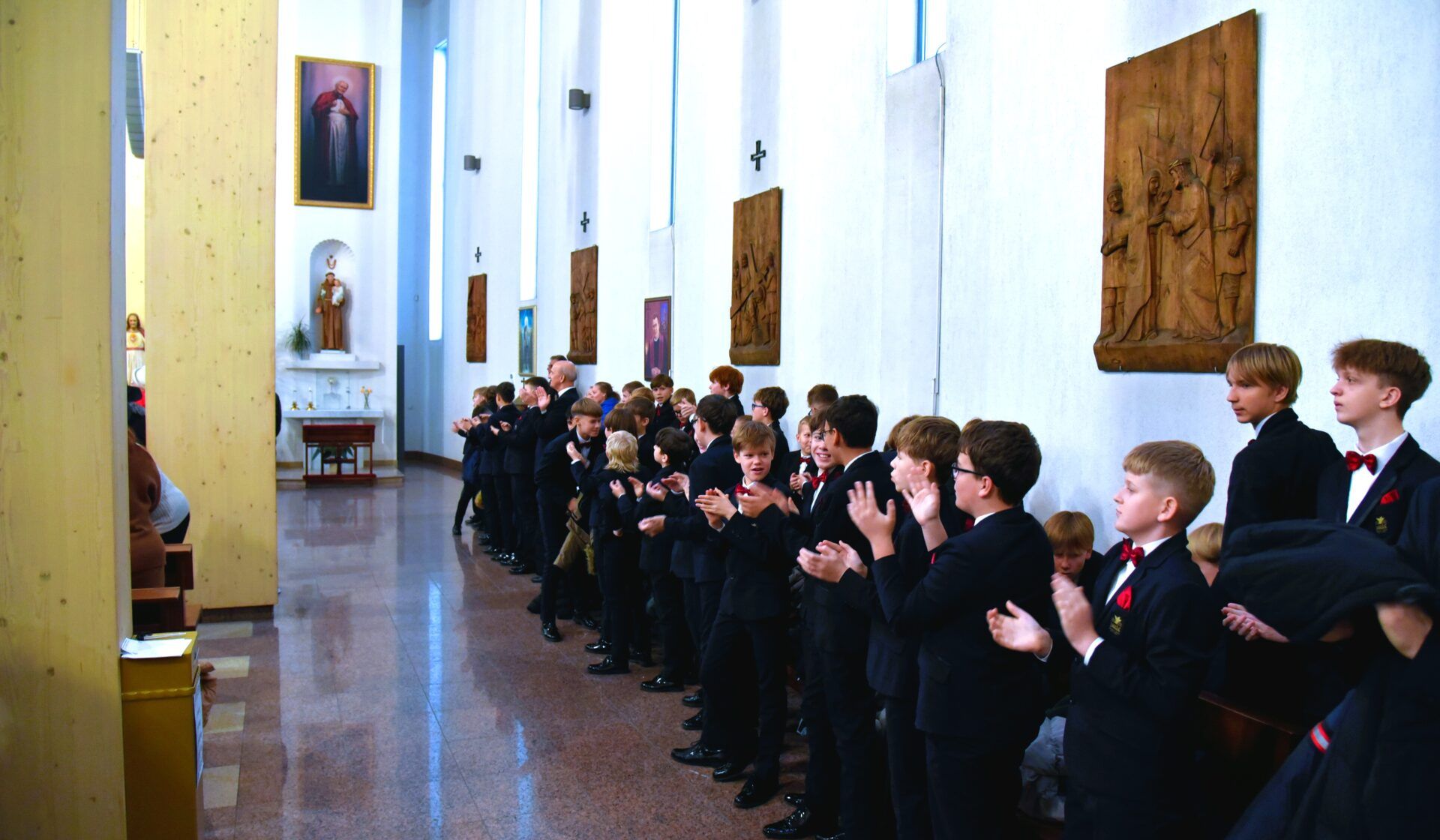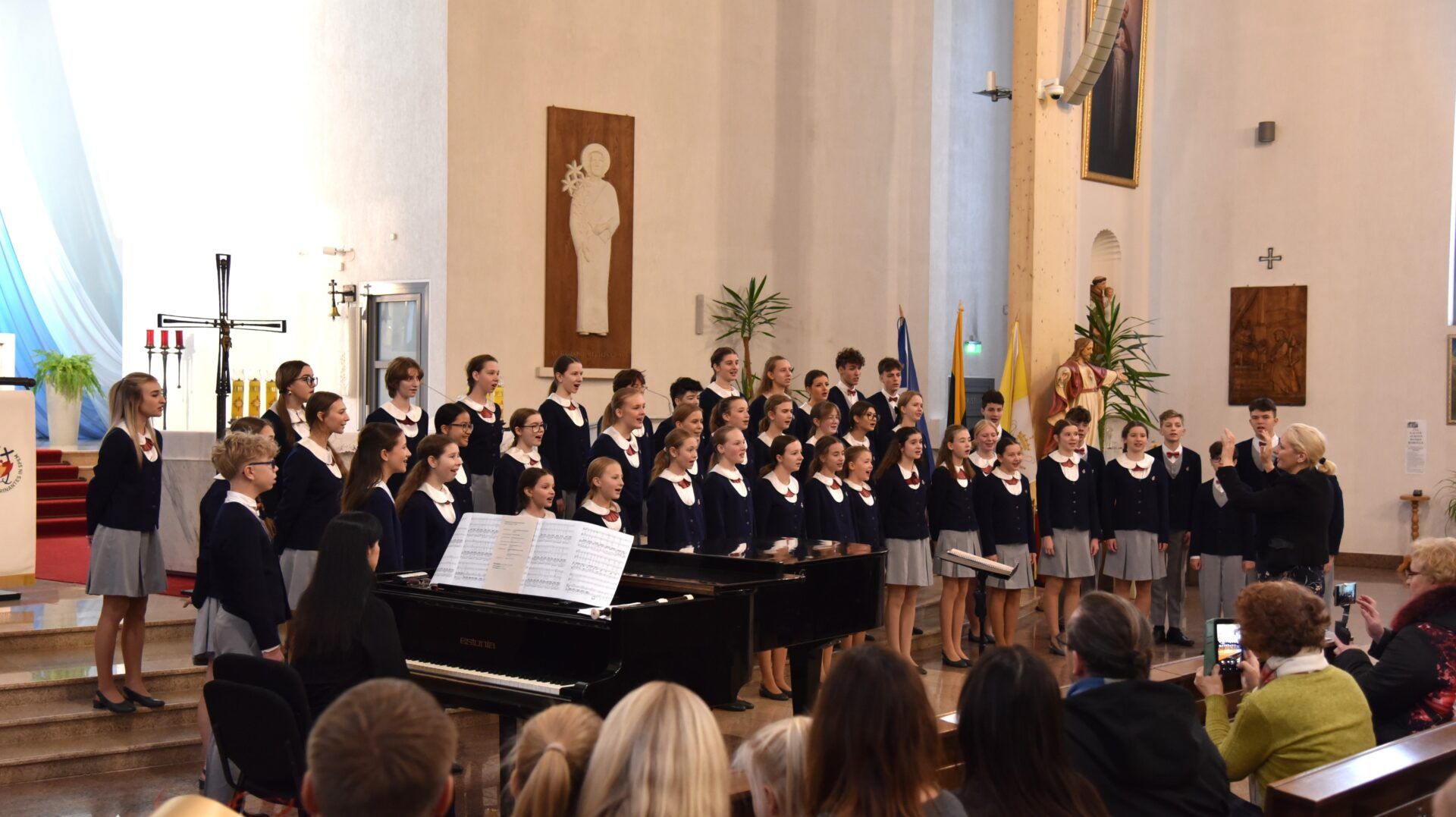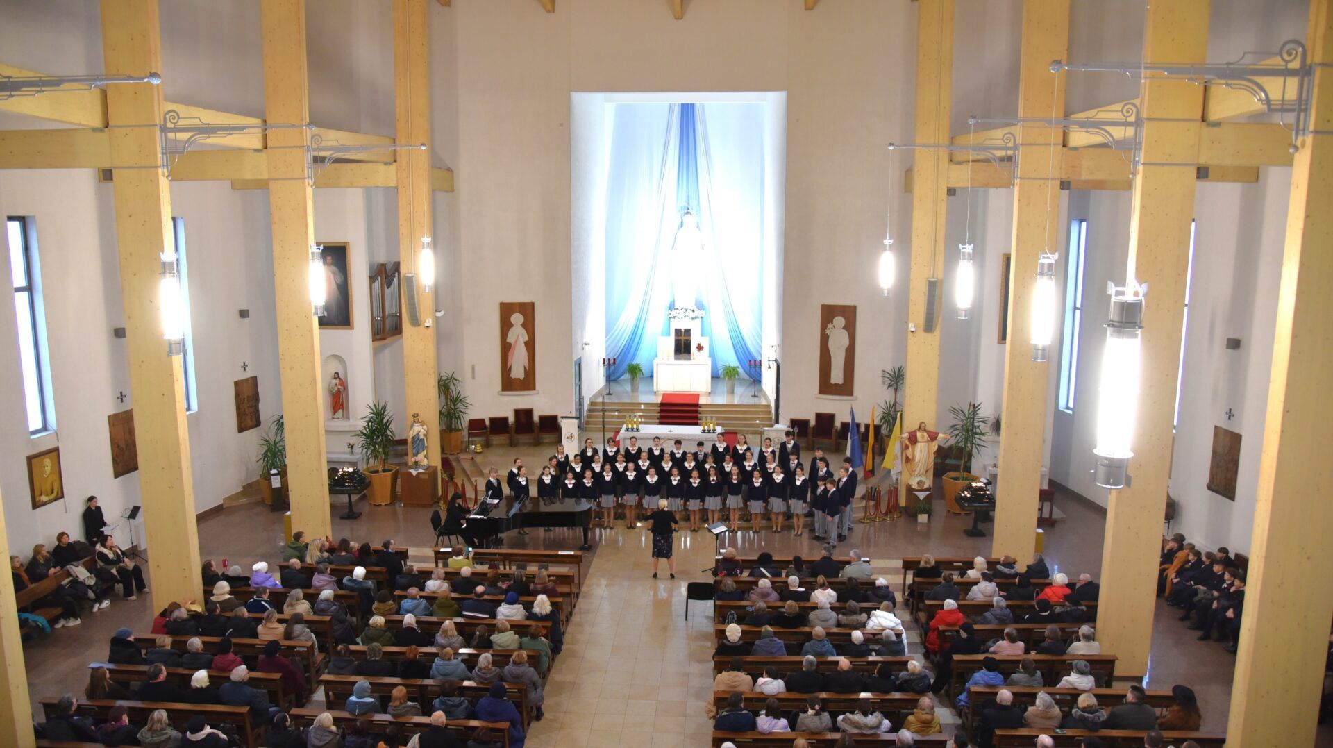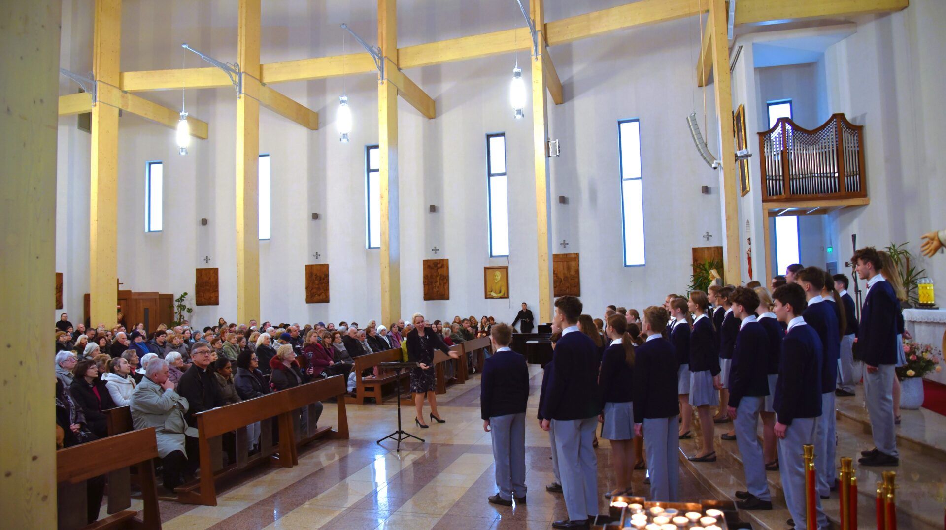 Náš zájezd se pomalu chýlí ke konci a my tu máme poslední festivalový den. Celé nedělní dopoledne strávily děti se svými hostitelskými rodinami, někde se šlo do ZOO, muzea či nakupovat, jinde se hrály deskové hry, někteří chlapci si prý raději dopřáli vydatný spánek😊. Po obědě jsme se všichni sešli u katolického kostela Mergelés Marijos v Šiauliai (mimochodem zkuste si to říct třikrát za sebou a máte skvělý jazykolam, ve skutečnosti se to vyslovuje „Šolé“), kde nás čekal již poslední koncert. Kromě Severáčku vystoupili i chlapci a mladí muži ze sboru Dagilélis. Oba dva programy měly duchovní charakter, sóla v Truvérské mši Petra Ebena měla zpívala tři nejstarší děvčata Adélka P., Anička T. a Majda K., byl to pro ně zároveň úplně poslední zájezdový koncert se Severáčkem. Ještě si s námi zazpívají v sobotu na Slavnostním koncertu v Divadle F. X. Šaldy. Kostel byl zaplněný do posledního místa a publikum opět odměnilo naše děti bouřlivým potleskem ve stoje. Byl to jeden ze zájezdových momentů, které si budeme ještě dlouho pamatovat. Zejména ukolébavka z opery Brundibár zněla v této chrámové akustice výjimečně průzračně. Po koncertu nám naši hostitelé domluvili bowling a pizzu v nedalekém nákupním centru, děti z obou sborů se tedy mohly dosytosti vydovádět na dráze a myslím, že to byl krásný závěr celého pobytu v Šiauliai.
